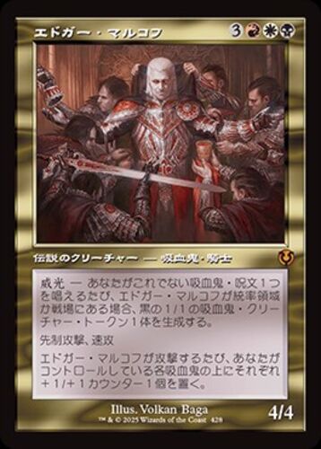 今日はこちら。 統率者2017にて登場した白黒赤の伝説のクリーチャー。 赤白黒6マナ4/4先制攻撃、速攻の伝説の吸血鬼・戦士で、 これでない吸血鬼・呪文1つを唱えるたび、黒の1/1の吸血鬼・クリーチャー・トークン1体を生成する威光能力、 これが攻撃するたび…